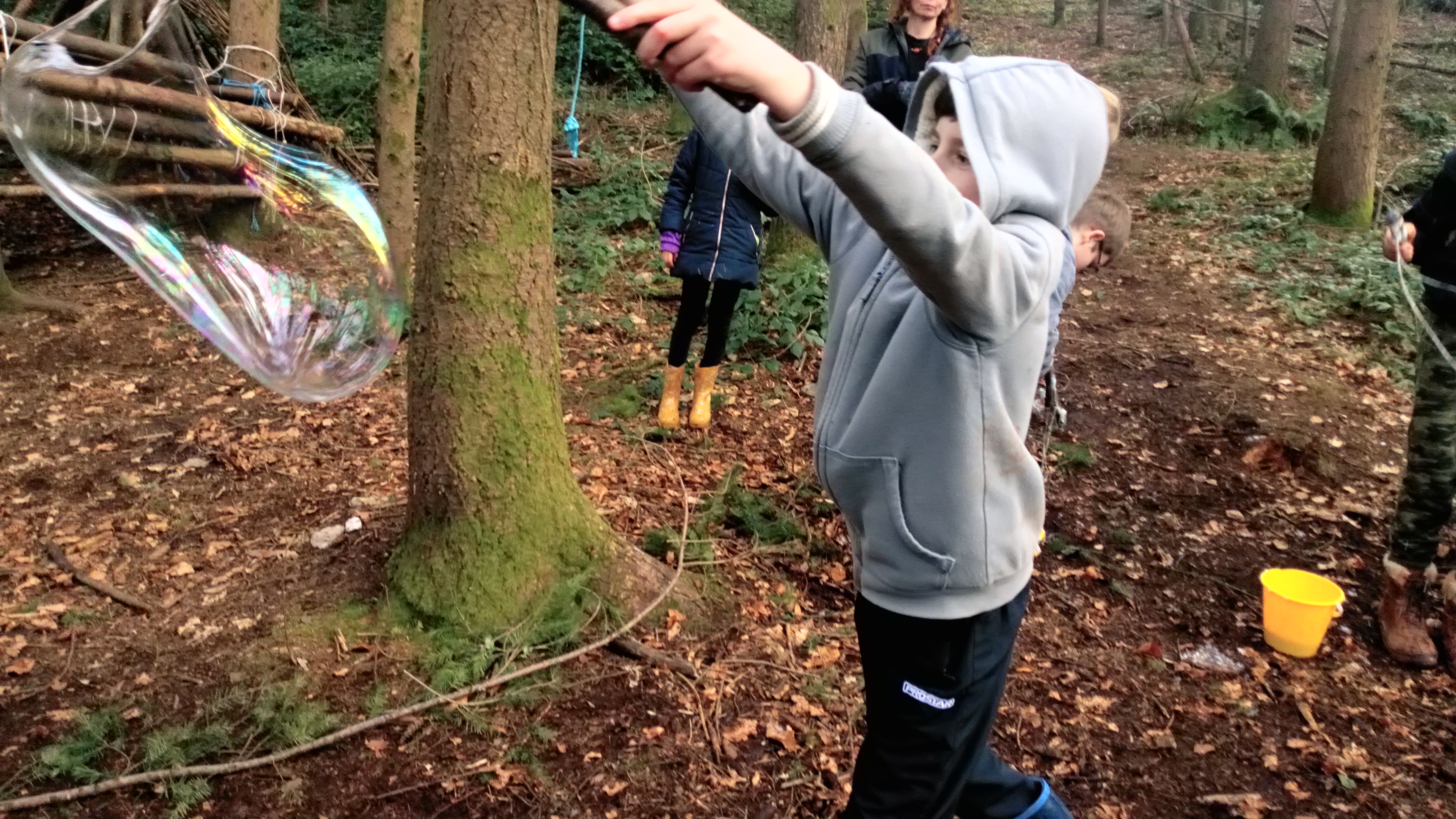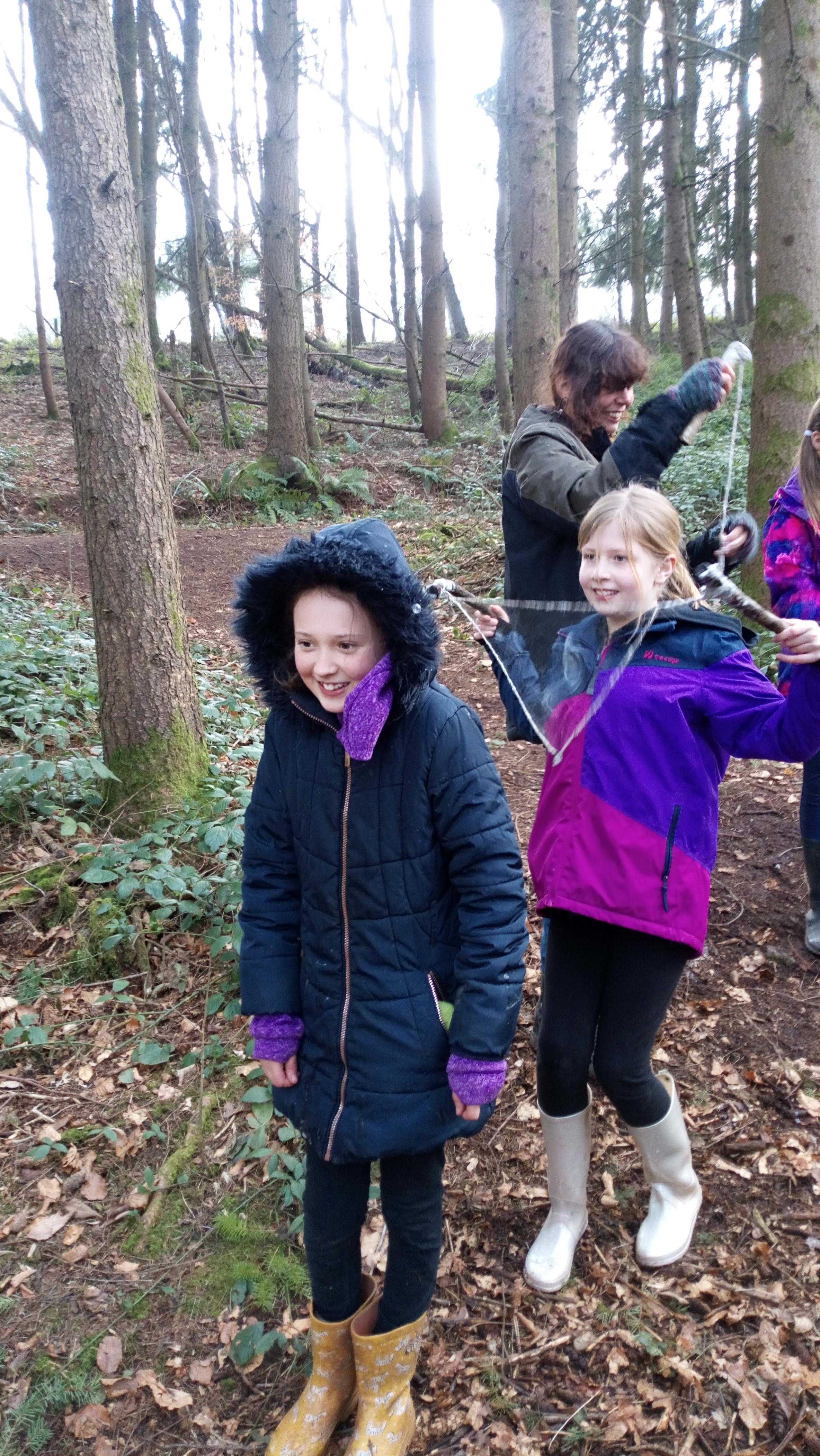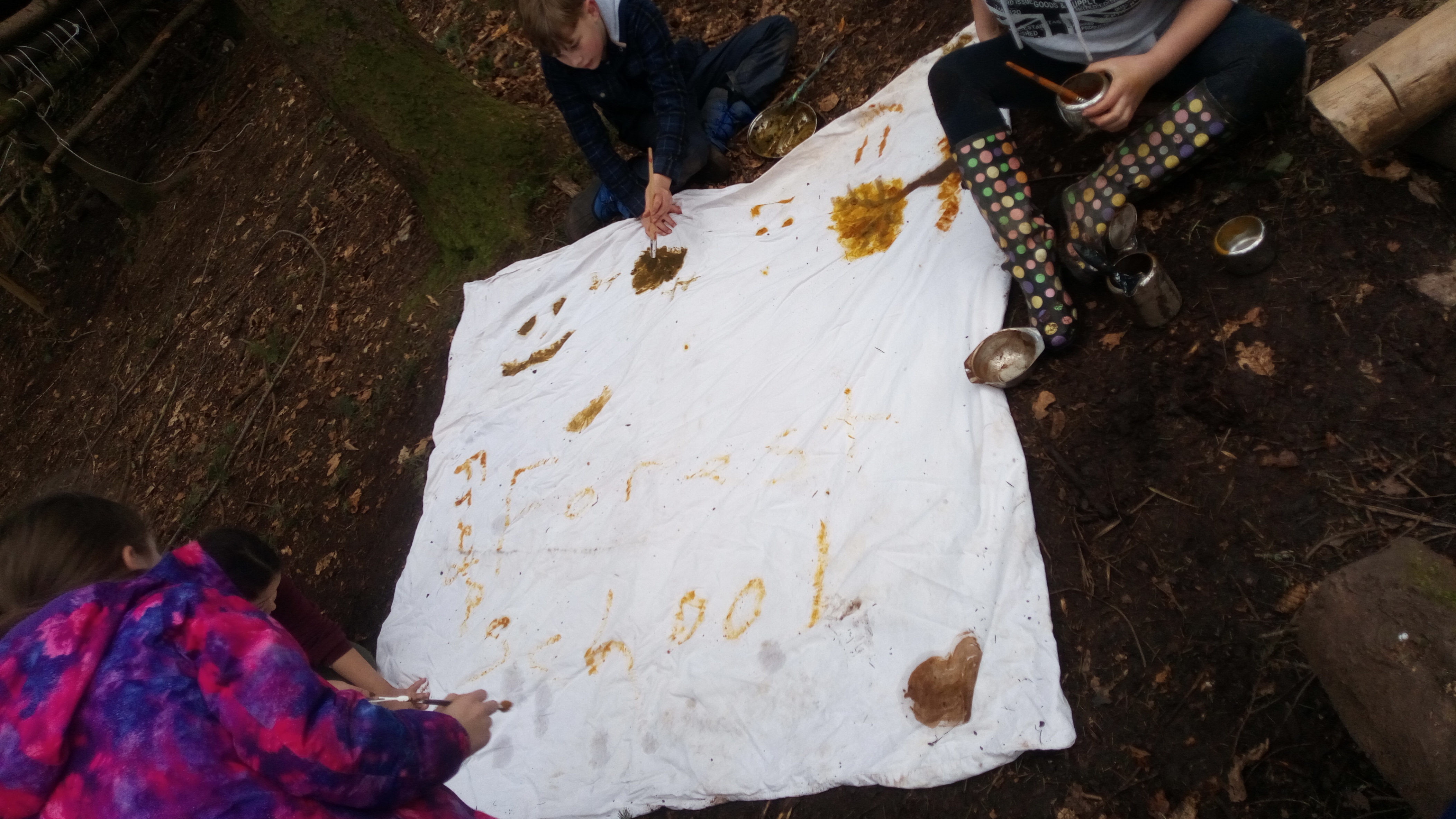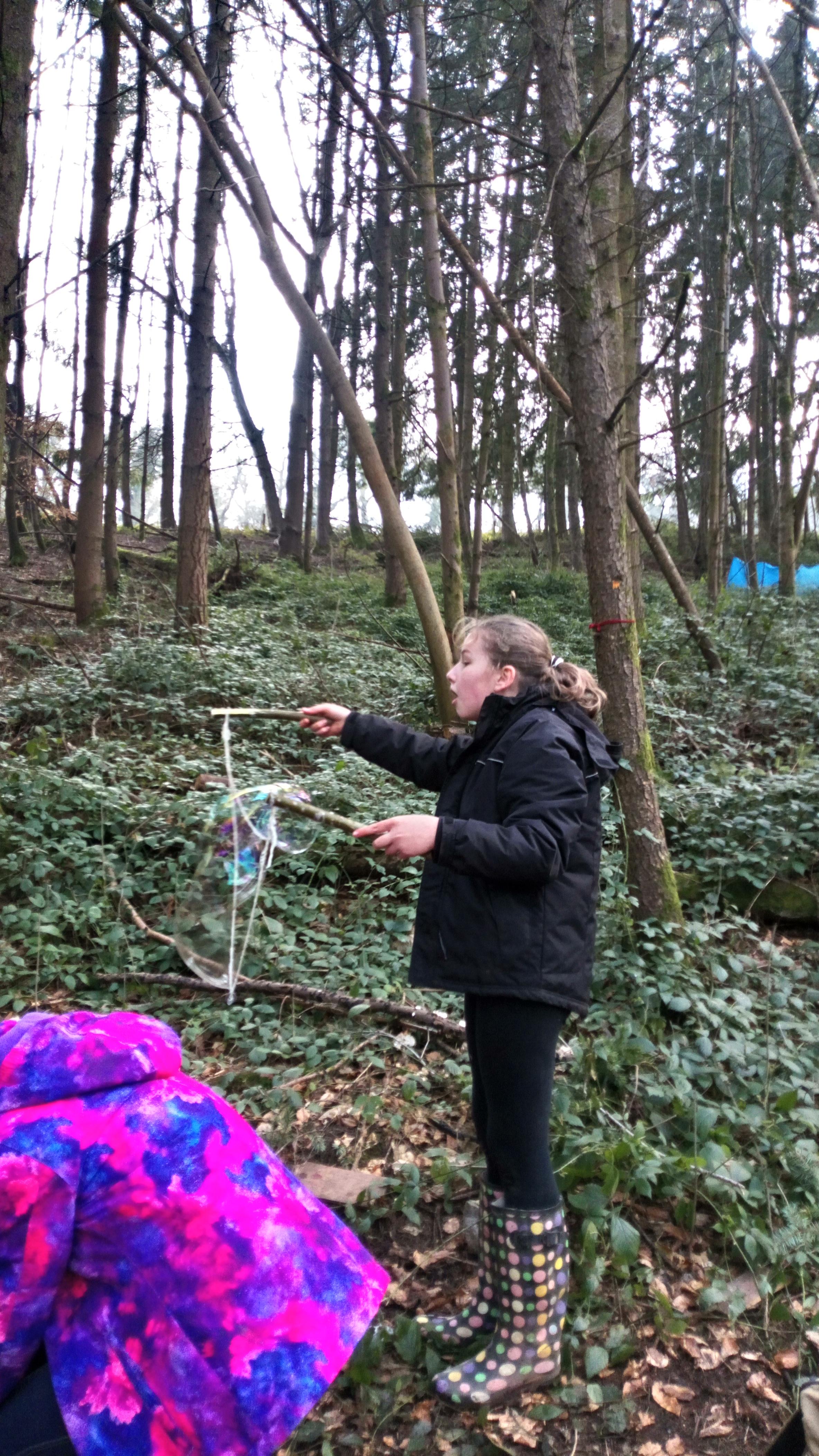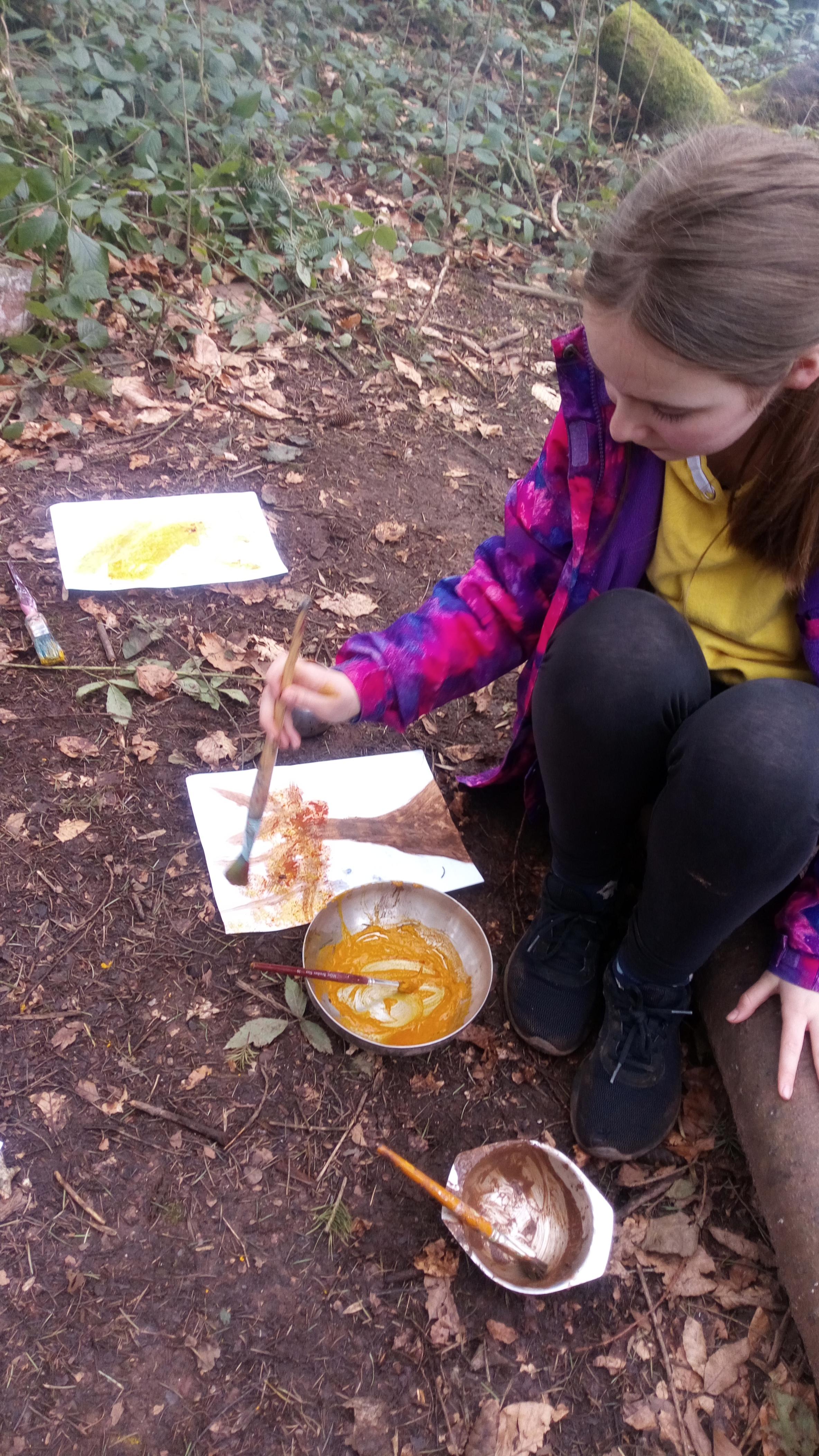 We have been grateful for the drier weather at forest school and for a burst of sunshine. Year 5 & 6 made their own wooden bubble wands and ‘magic’ mix with some ingredients to make super large bubbles! Our bubbles looked amazing catching the light of the low winter sunshine. We have also been experimenting with natural paints using mud, kitchen spices, crushed up leaves and charcoal from the fire – take a look at some of the children’s paintings.
